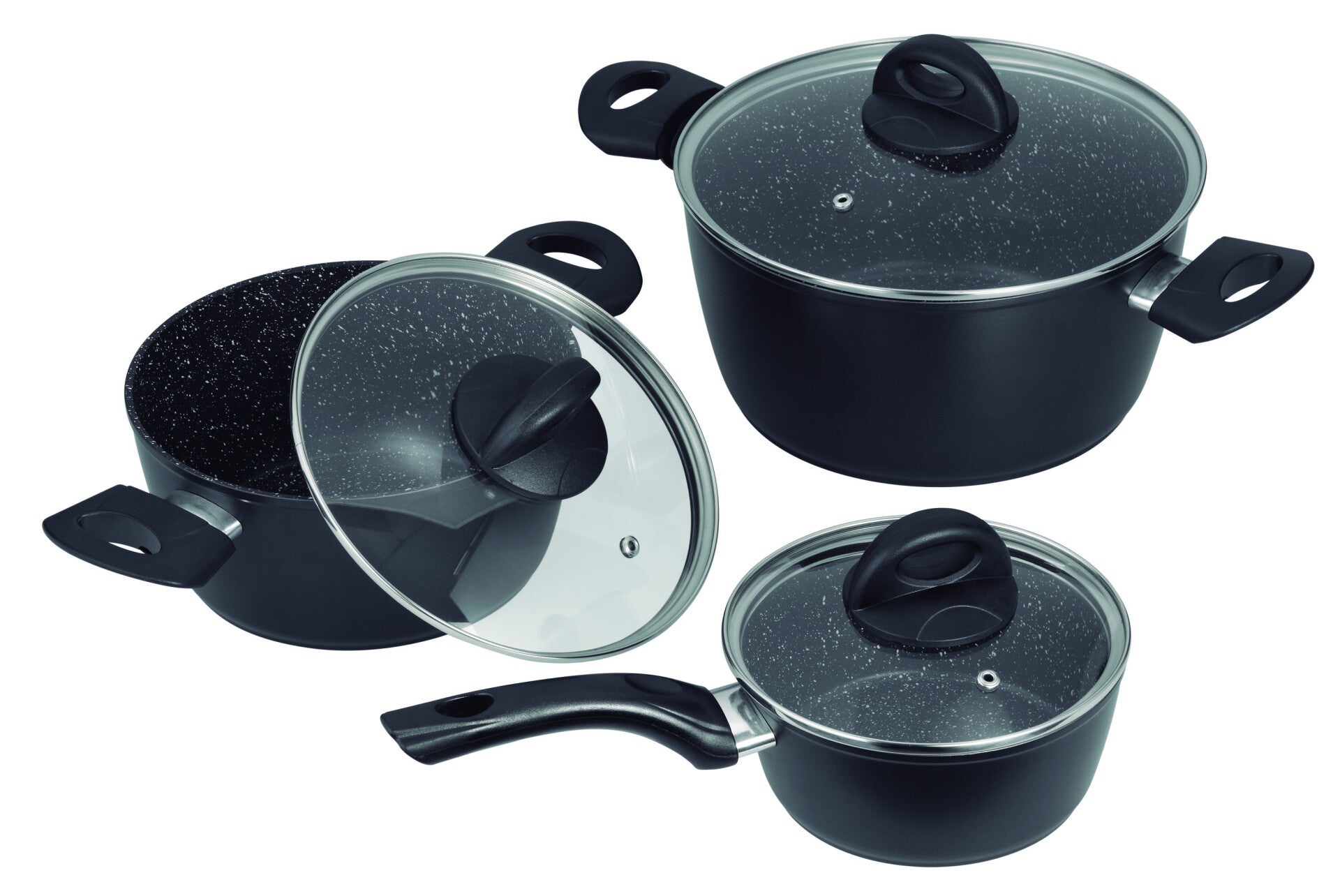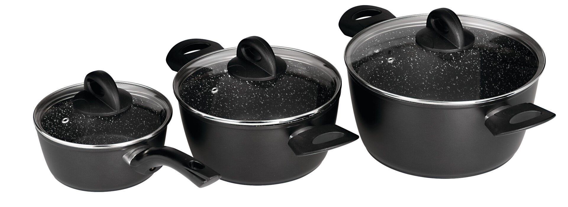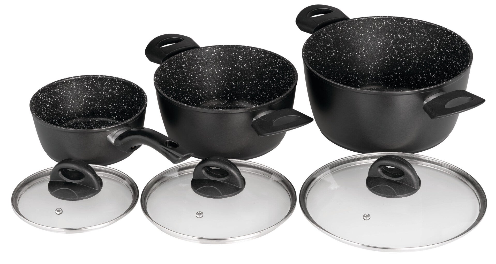 Batería de cocina 3 piezas con tapas. Fondo difusor inducción total y base sandwich de 3 mm para mantenimiento, control y difusión perfecta del calor.